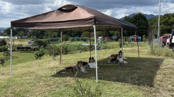 団体練習も行われました。暑い日でしたので、犬たちの負担が少ないよう、テント下で「伏せ」「座れ」です。